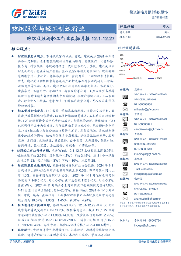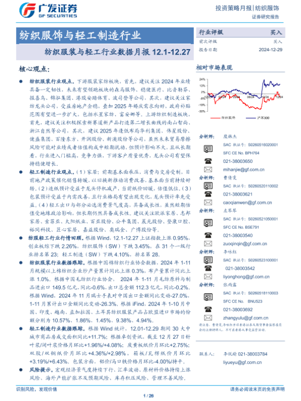 【广发证券】【20241229】纺织服饰与轻工制造行业:纺织服装与轻工行业数据月报-26页