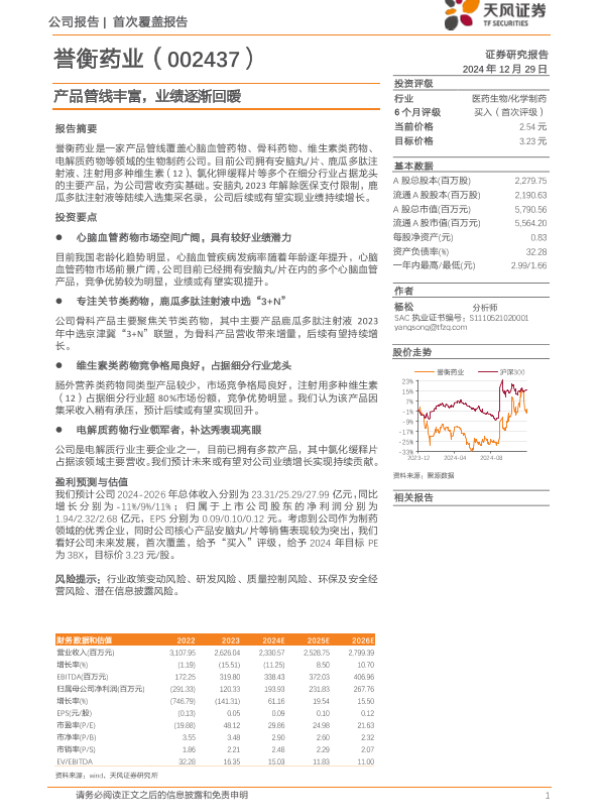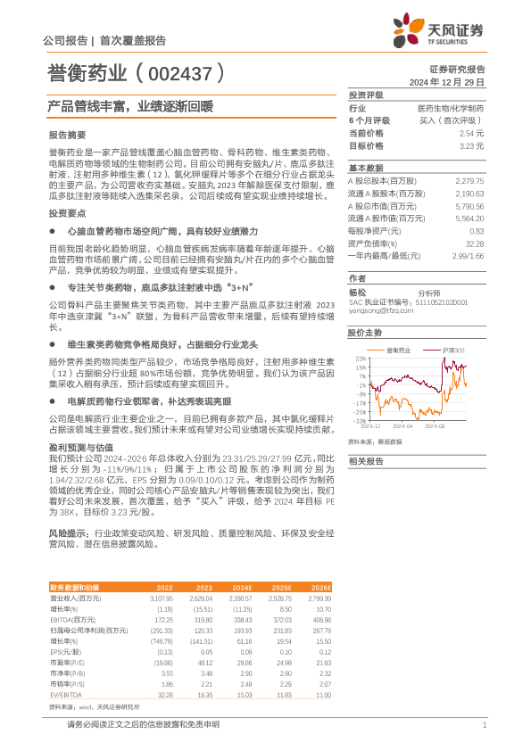 【天风证券】【20241229】誉衡药业(002437)产品管线丰富,业绩逐渐回暖-17页