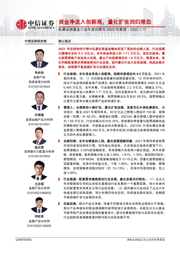 【中信证券】【20220117】私募证券基金行业年度回顾与2022年展望:资金净流入创新高,量化扩张回归常态-26页