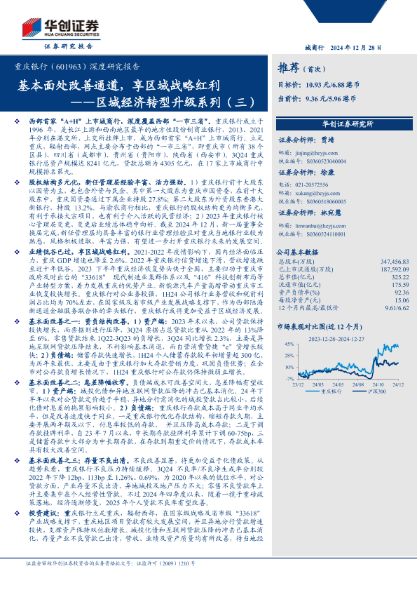 【华创证券】【20241228】重庆银行(601963)深度研究报告:区域经济转型升级系列(三),基本面处改善通道,享区域战略红利-22页