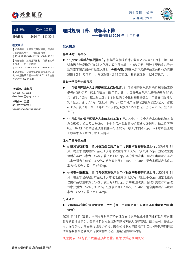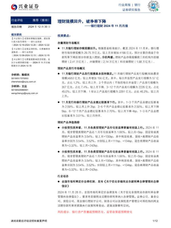 【兴业证券】【20241230】银行业理财2024年11月月报:理财规模回升,破净率下降-12页