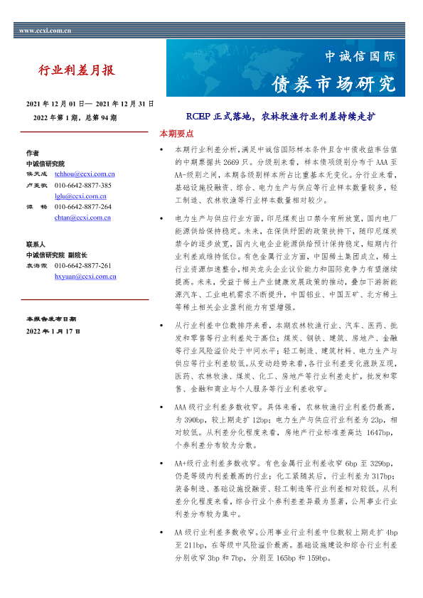 【中诚信国际】【20220117】行业利差月报:RCEP正式落地,农林牧渔行业利差持续走扩-15页