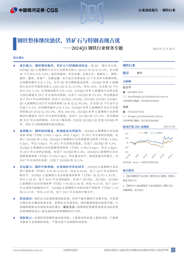 【银河证券】【20241220】2024Q3钢铁行业财务专题:钢铁整体继续蛰伏,铁矿石与特钢表现占优-24页