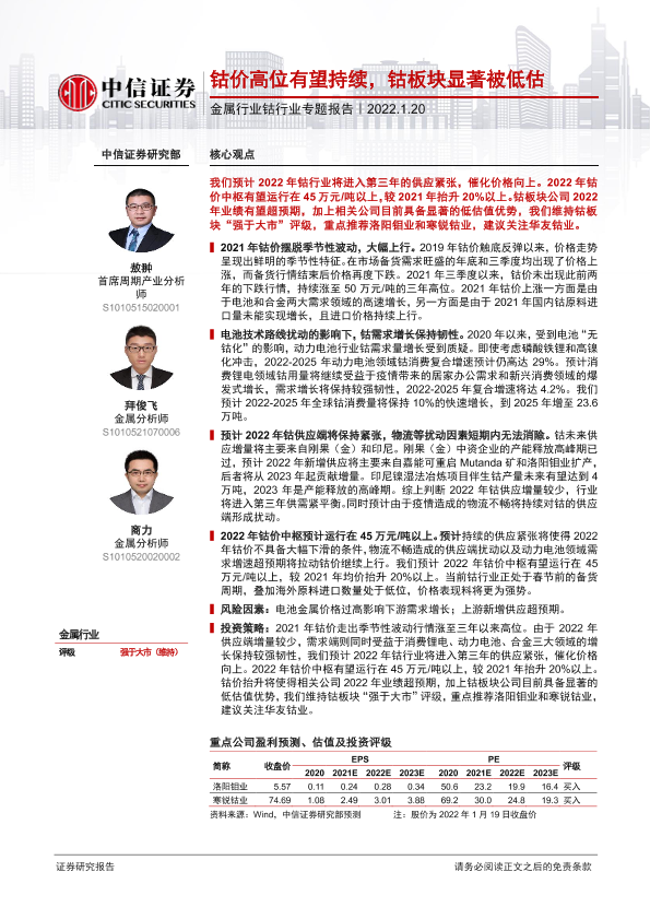 【中信证券】【20220120】金属行业钴行业专题报告:钴价高位有望持续,钴板块显著被低估-23页