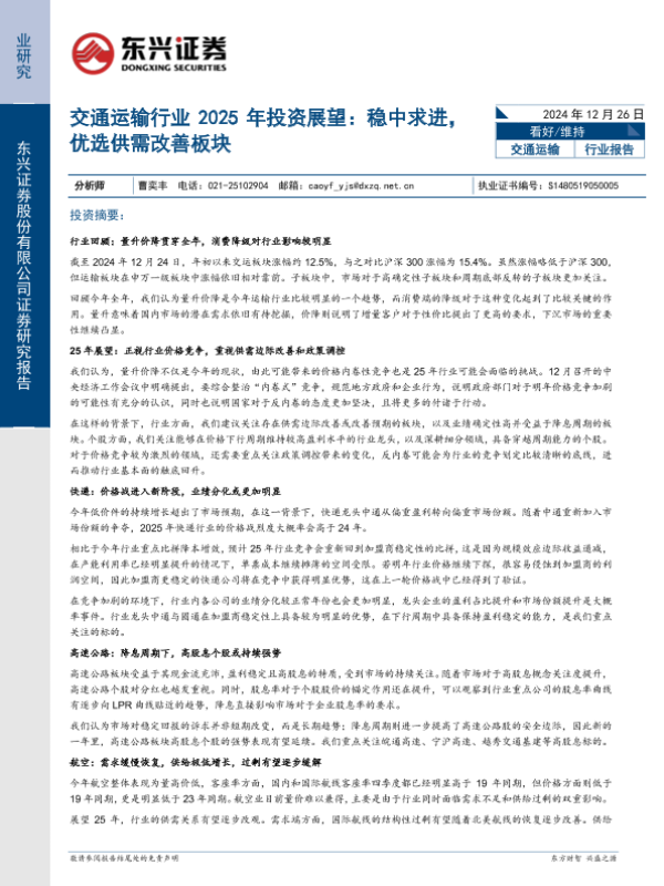 【东兴证券】【20241226】交通运输行业2025年投资展望:稳中求进,优选供需改善板块-26页