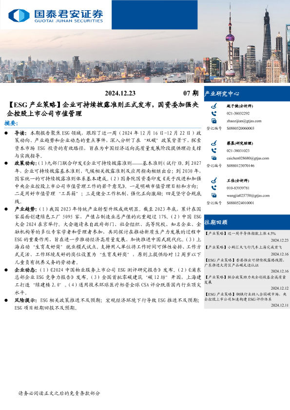【国泰君安证券】【20241223】产业策略07期:【ESG产业策略】企业可持续披露准则正式发布,国资委加强央企控股上市公司市值管理-10页