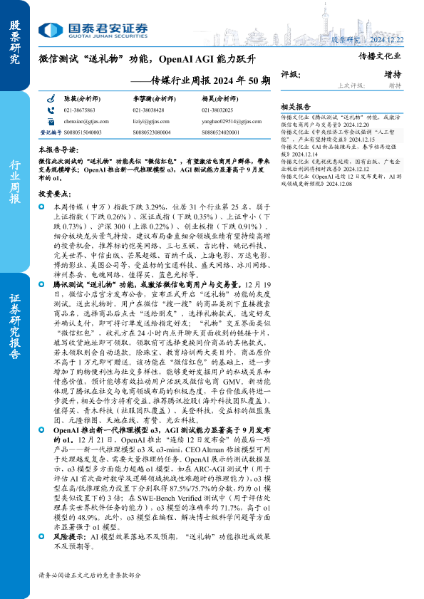 【国泰君安证券】【20241222】传媒行业周报2024年50期:微信测试“送礼物”功能,OpenAI AGI能力跃升-13页