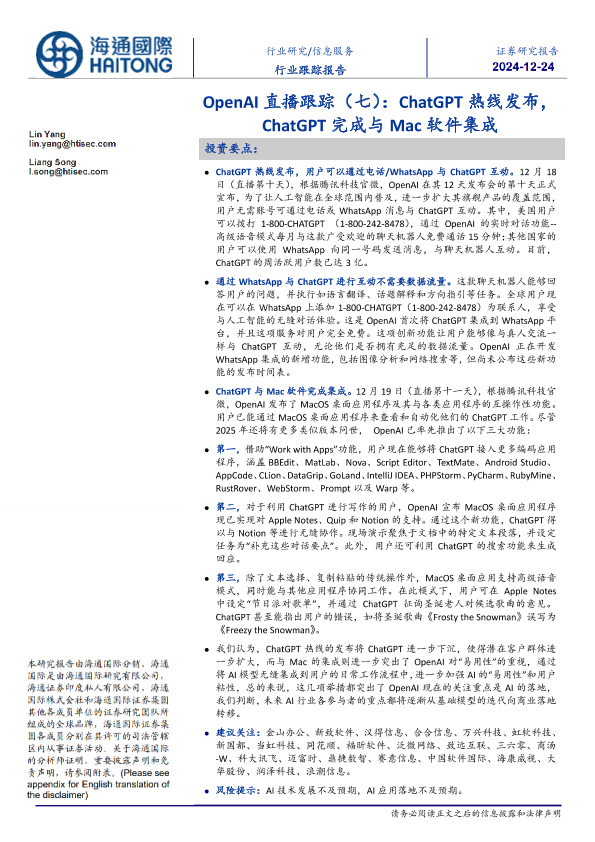 【海通国际】【20241224】信息服务行业OpenAI直播跟踪(七):ChatGPT热线发布,ChatGPT完成与Mac软件集成-10页