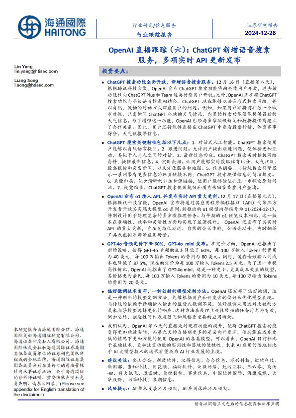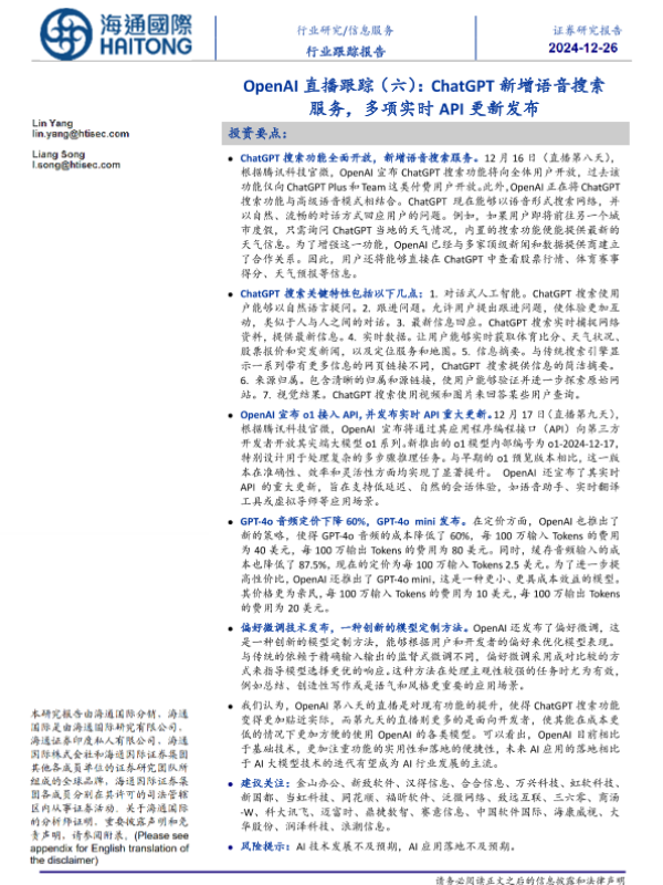 【海通国际】【20241226】信息服务行业OpenAI直播跟踪(六):ChatGPT新增语音搜索服务,多项实时API更新发布-11页