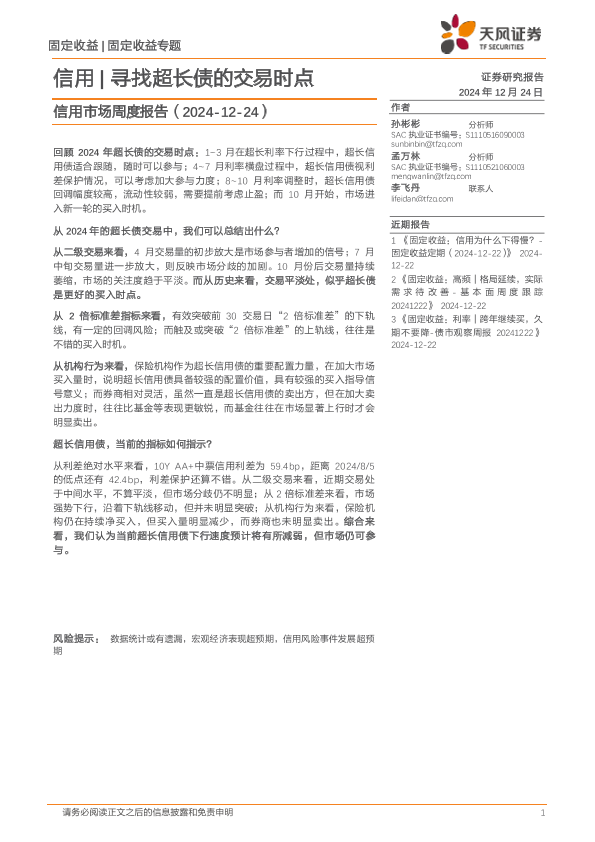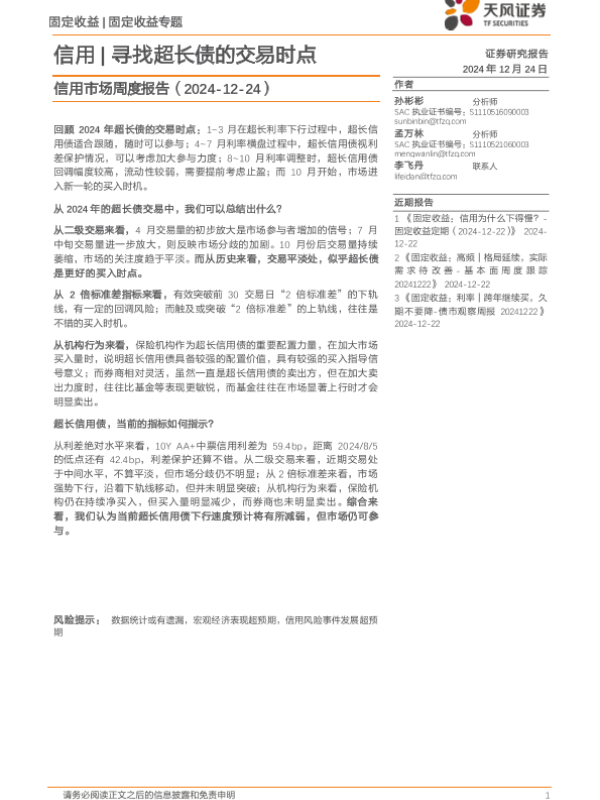 【天风证券】【20241224】信用市场报告:信用,寻找超长债的交易时点-10页