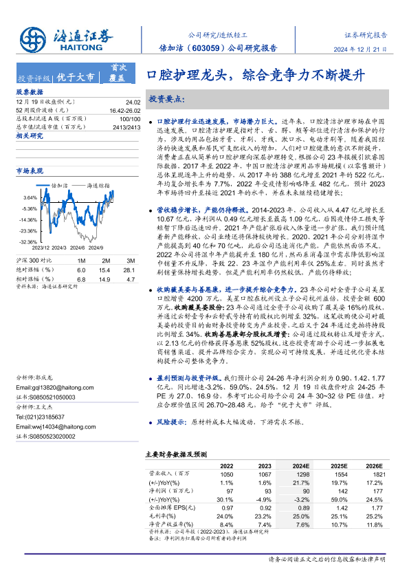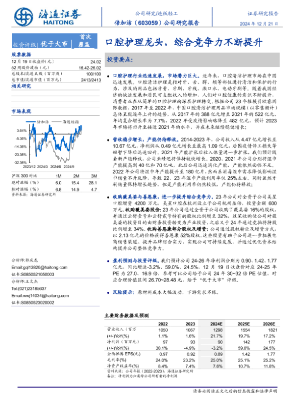 【海通证券】【20241221】倍加洁(603059)公司研究报告:口腔护理龙头,综合竞争力不断提升-20页