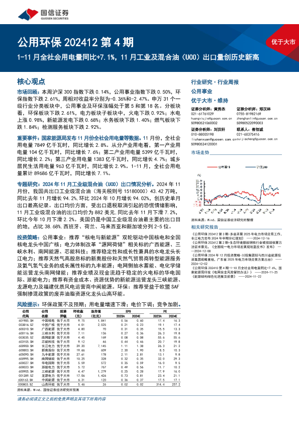 【国信证券】【20241222】用环保行业202412第4期:1-11月全社会用电量同比+7.1%,11月工业及混合油(UCO)出口量创历史新高-26页