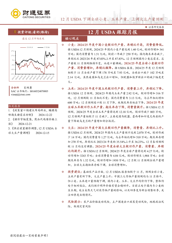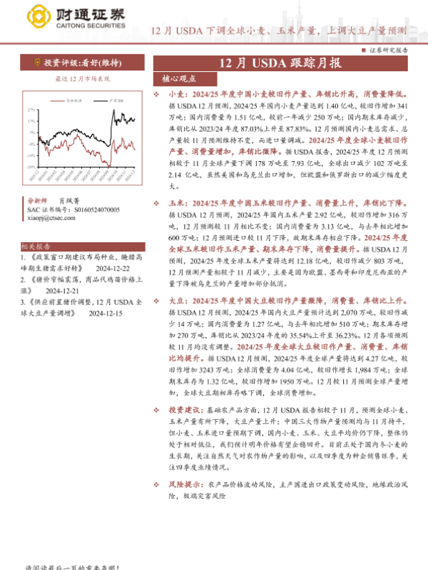 【财通证券】【20241225】农林牧渔行业12月USDA跟踪月报:12月USDA下调全球小麦、玉米产量,上调大豆产量预测-14页
