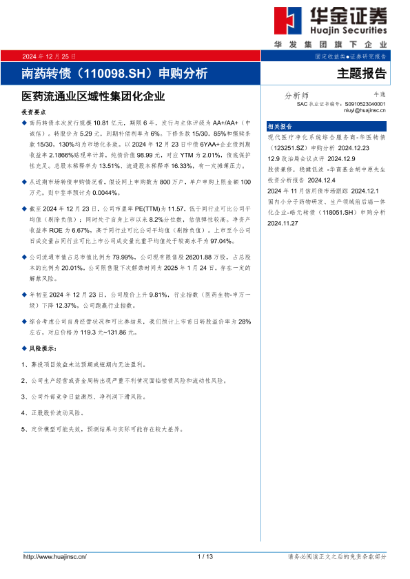 【华金证券】【20241225】南药转债(110098.SH)申购分析:医药流通业区域性集团化企业-13页