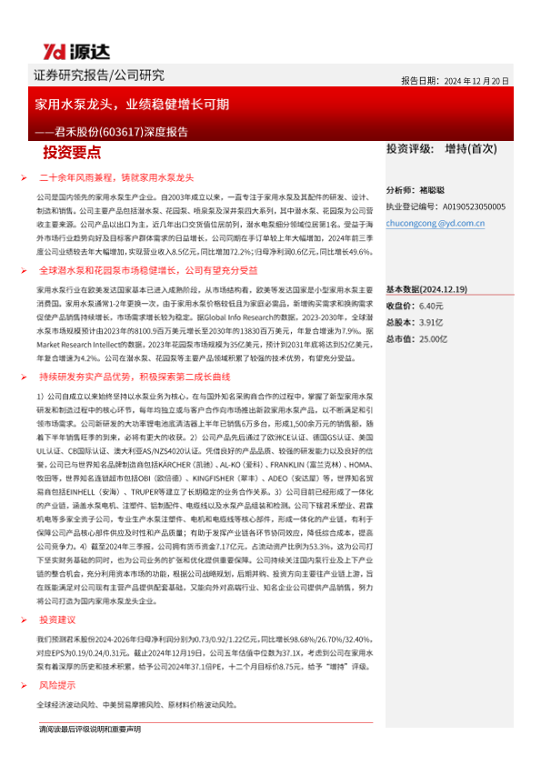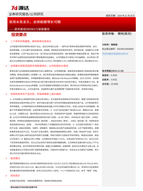【源达信息】【20241220】君禾股份(603617)深度报告:家用水泵龙头,业绩稳健增长可期-24页