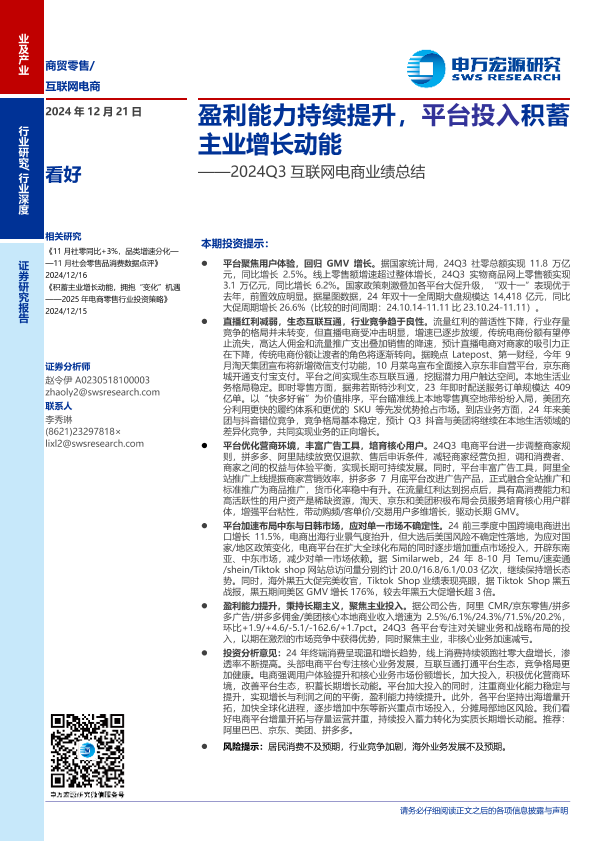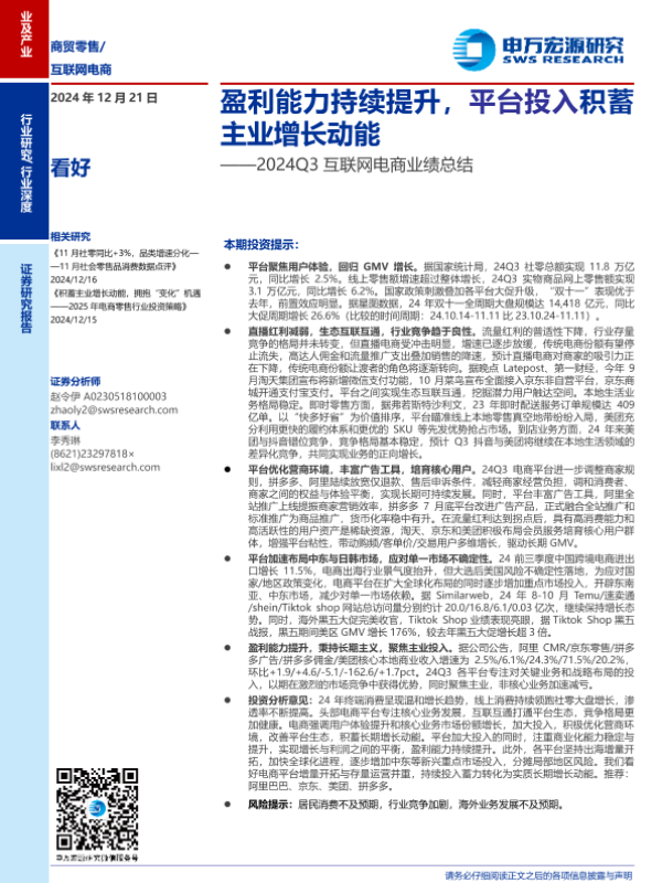 【申万宏源】【20241221】商贸零售行业2024Q3互联网电商业绩总结:盈利能力持续提升,平台投入积蓄主业增长动能-20页