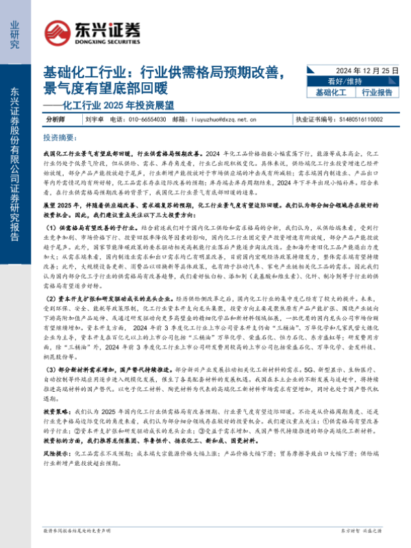 【东兴证券】【20241225】基础化工行业2025年投资展望:行业供需格局预期改善,景气度有望底部回暖-16页