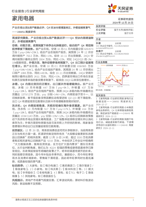 【天风证券】【20241225】家用电器行业24W51周度研究:产业在线出货&排产数据点评,Q4空冰内销增速转正,外销延续高景气-15页