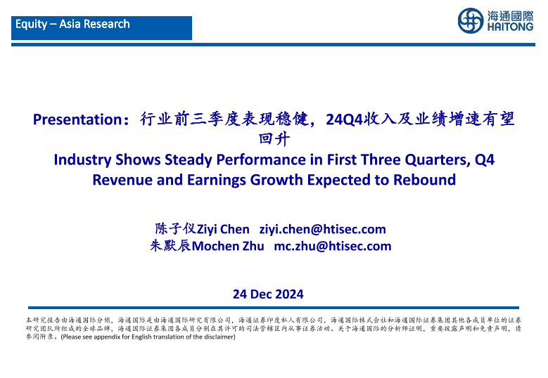 【海通国际】【20241224】家电行业:行业前三季度表现稳健,24Q4收入及业绩增速有望回升-53页