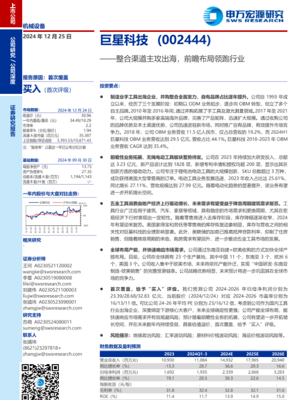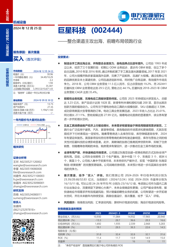 【申万宏源】【20241225】巨星科技(002444)整合渠道主攻出海,前瞻布局领跑行业-37页