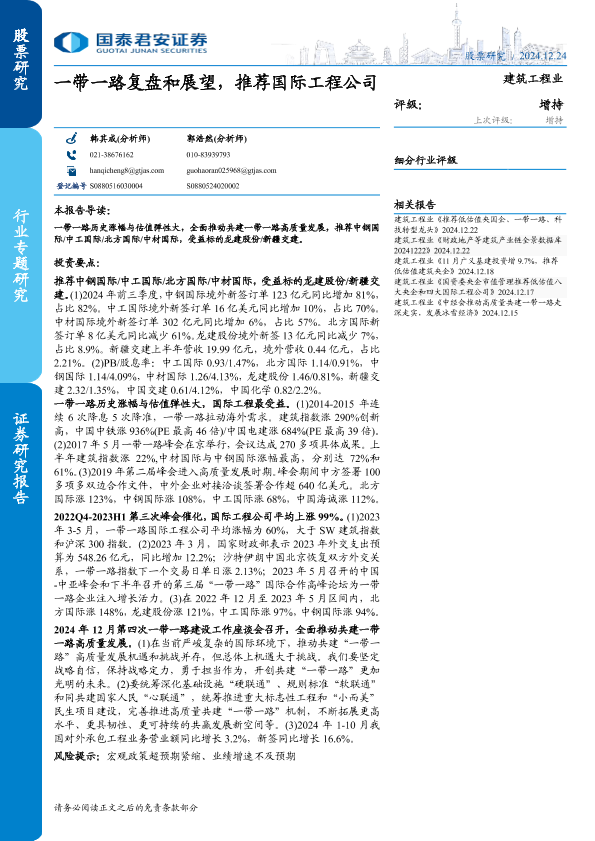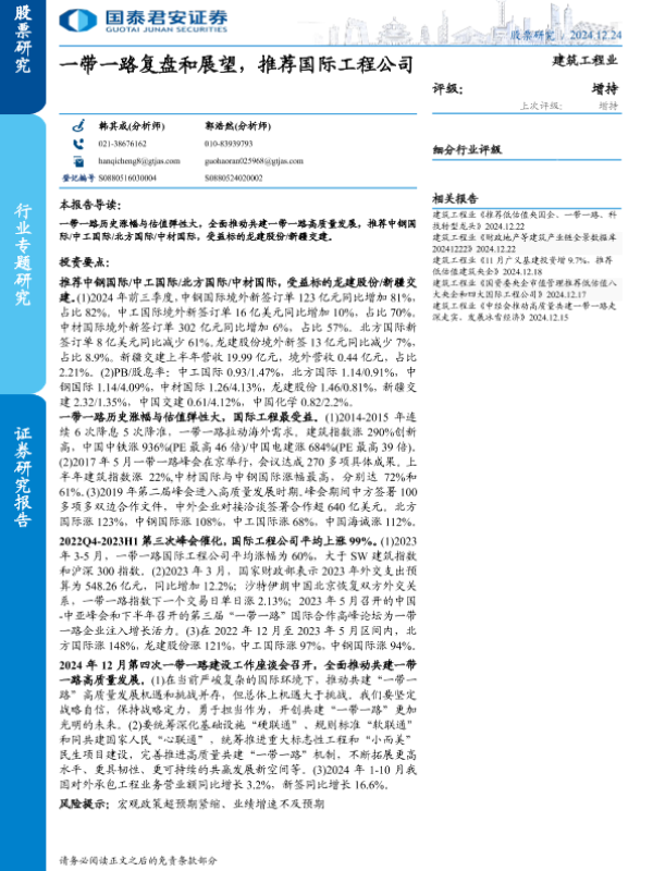 【国泰君安证券】【20241224】建筑工程行业:一带一路复盘和展望,推荐国际工程公司-43页
