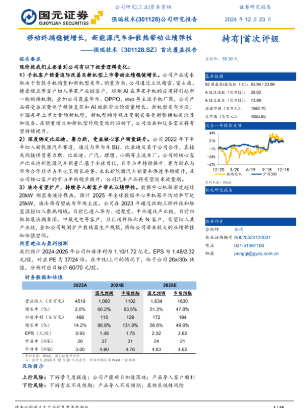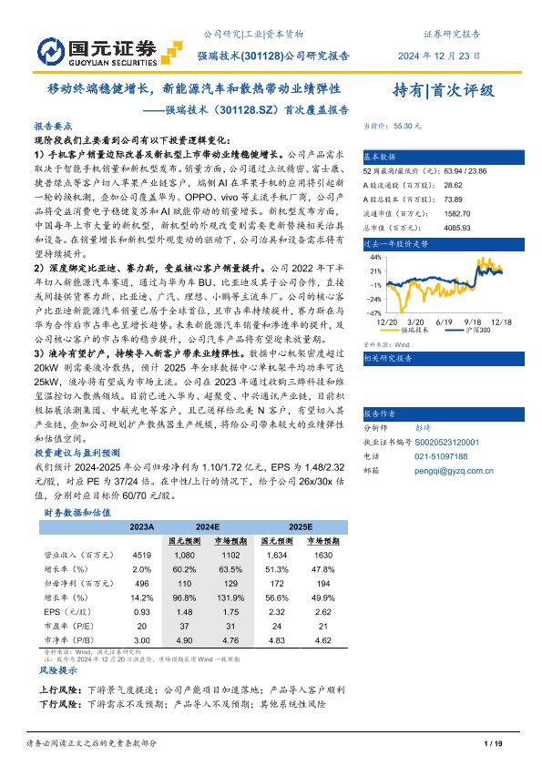 【国元证券】【20241223】强瑞技术(301128)首次覆盖报告:移动终端稳健增长,新能源汽车和散热带动业绩弹性-19页