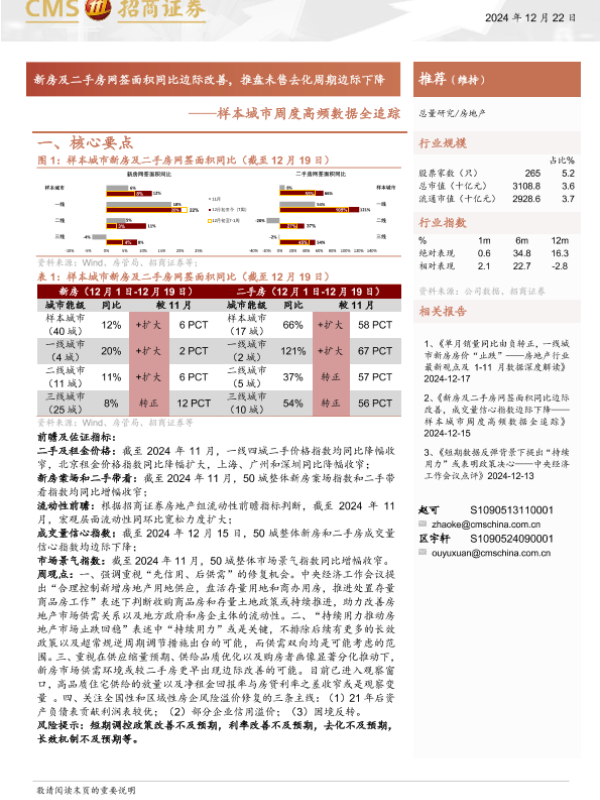 【海通证券】【20241222】房地产行业样本城市周度高频数据全追踪:新房及二手房网签面积同比边际改善,推盘未售去化周期边际下降-12页
