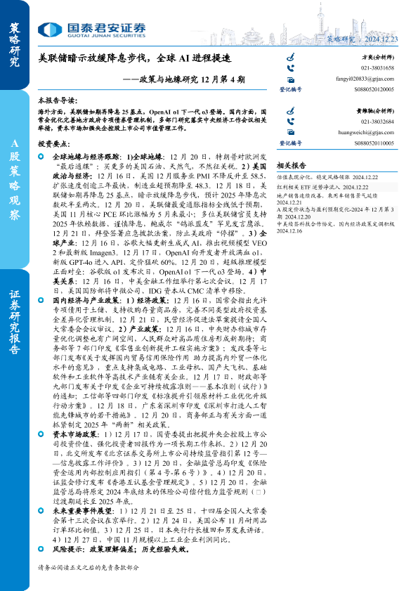 【国泰君安证券】【20241223】政策与地缘研究12月第4期:美联储暗示放缓降息步伐,全球AI进程提速-12页