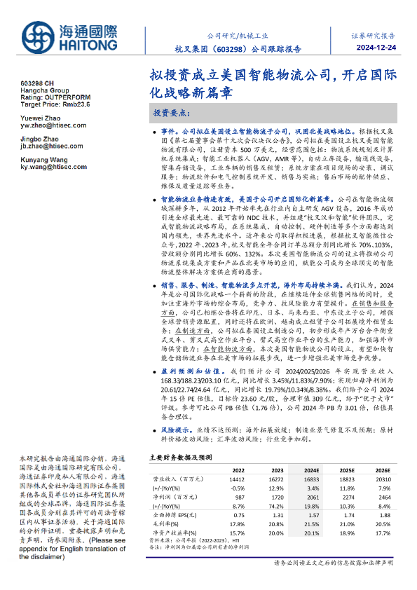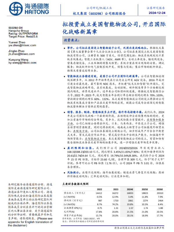 【海通国际】【20241224】杭叉集团(603298)公司跟踪报告:拟投资成立美国智能物流公司,开启国际化战略新篇章-14页