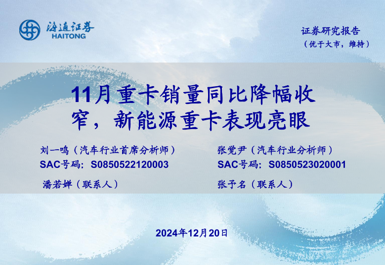 【海通证券】【20241220】汽车行业:11月重卡销量同比降幅收窄,新能源重卡表现亮眼-26页