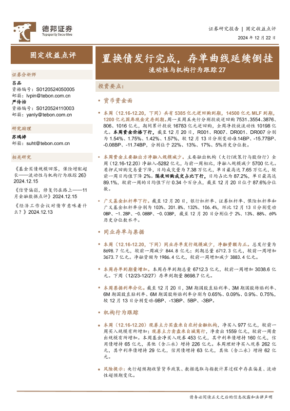 【德邦证券】【20241222】流动性与机构行为跟踪27:置换债发行完成,存单曲线延续倒挂-18页