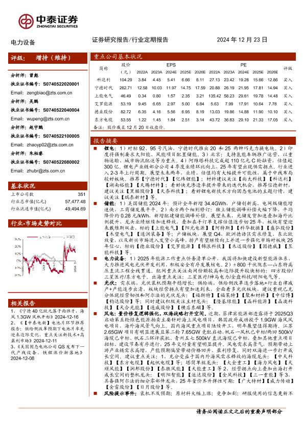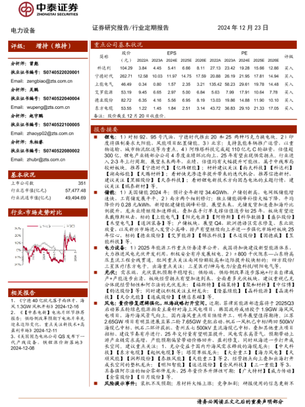 【中泰证券】【20241223】电力设备行业:宁德推出两类标准换电块,江苏启动第二轮7.65GW海风竞配-21页