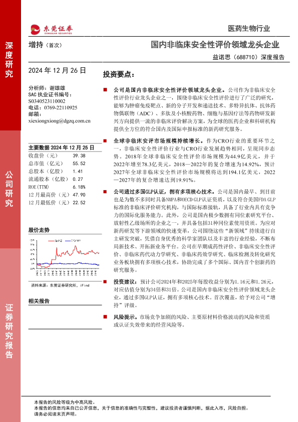 【东莞证券】【20241226】益诺思(688710)深度报告:国内非临床安全性评价领域龙头企业-20页