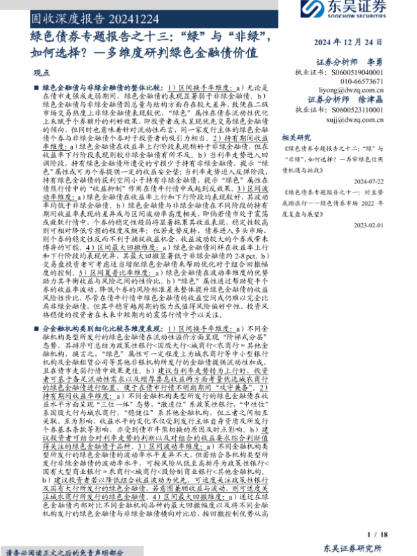 【东吴证券】【20241224】绿色债券专题报告之十三:多维度研判绿色金融债价值,“绿”与“非绿”,如何选择?-18页