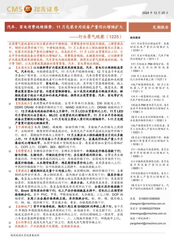 【海通证券】【20241225】行业景气观察(1225):汽车、家电消费延续强势,11月包装专用设备产量同比增幅扩大-31页