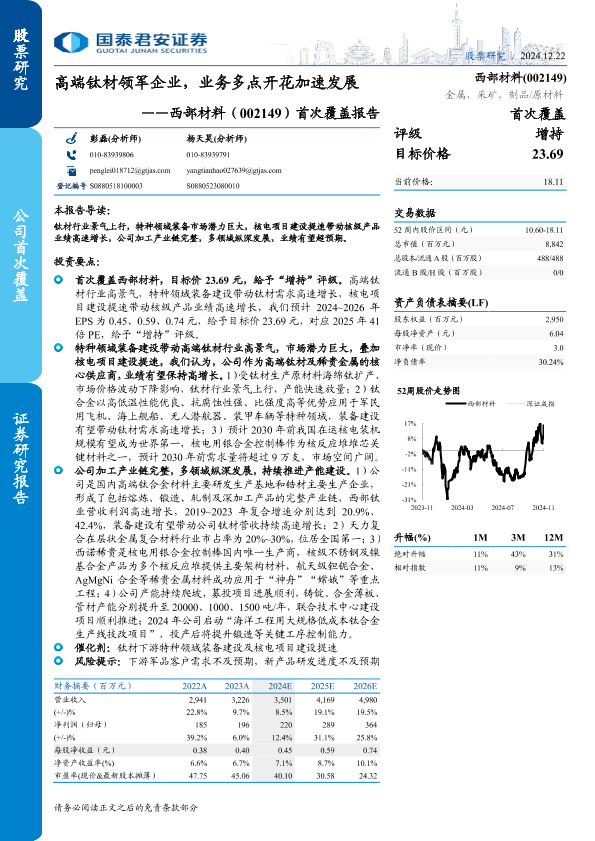 【国泰君安证券】【20241222】西部材料(002149)首次覆盖报告:高端钛材领军企业,业务多点开花加速发展-18页