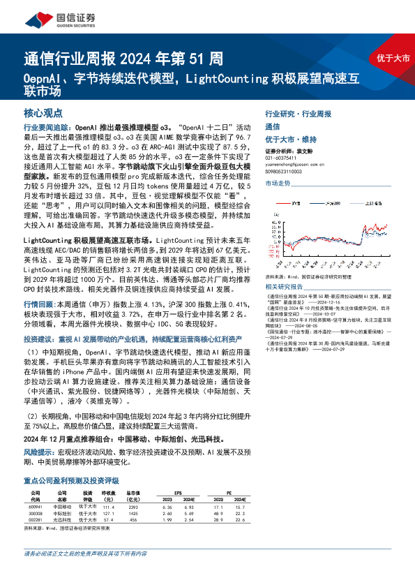 【国信证券】【20241222】通信行业周报2024年第51周:OepnAI、字节持续迭代模型,LightCounting积极展望高速互联市场-22页