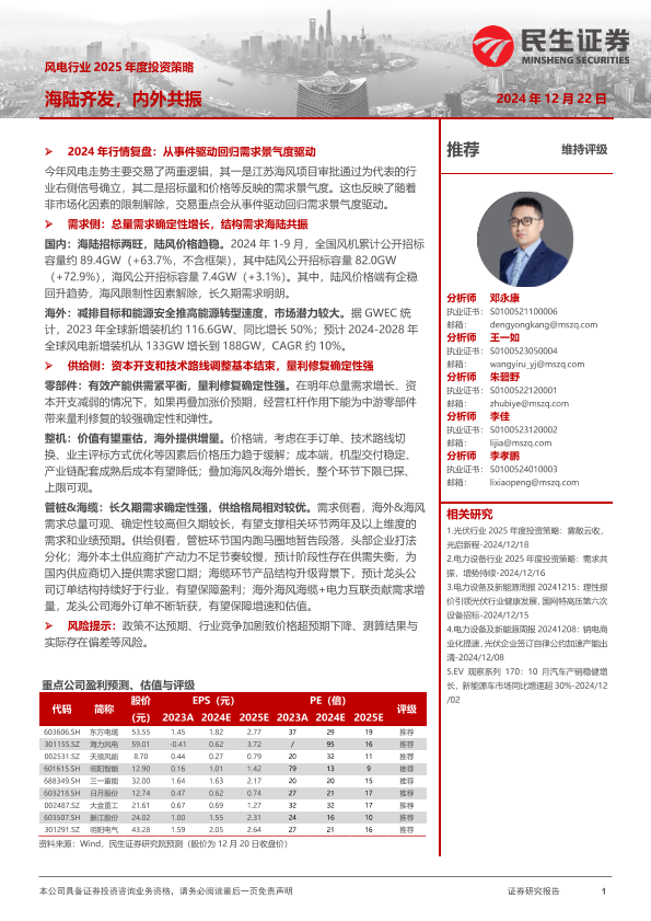 【民生证券】【20241222】风电行业2025年度投资策略:海陆齐发,内外共振-20页