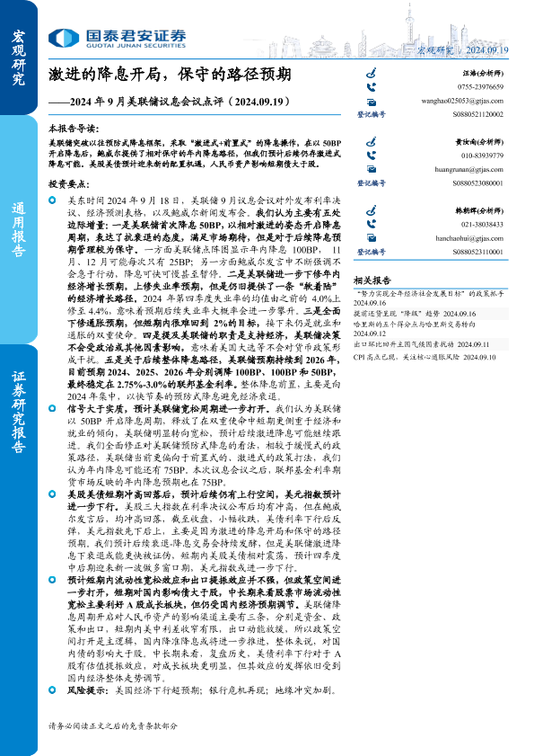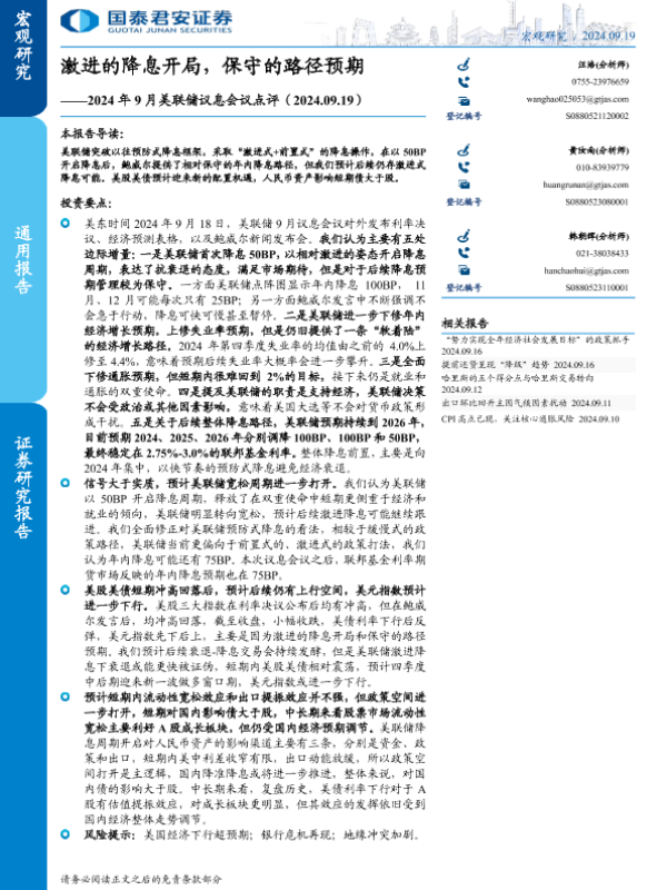 【国泰君安证券】【20240919】2024年9月美联储议息会议点评:激进的降息开局,保守的路径预期-12页