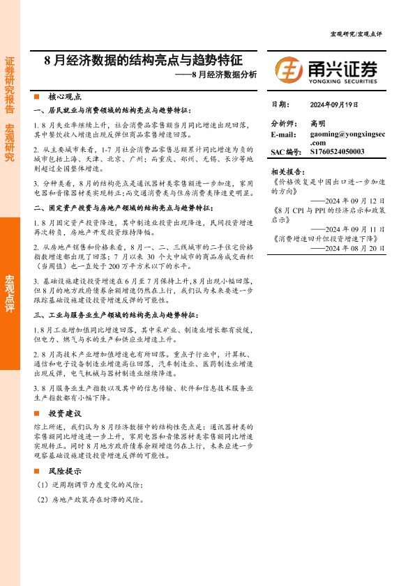 【甬兴证券】【20240919】8月经济数据分析:8月经济数据的结构亮点与趋势特征-10页