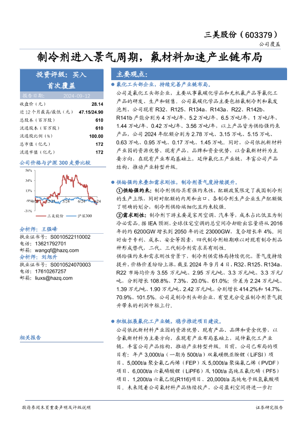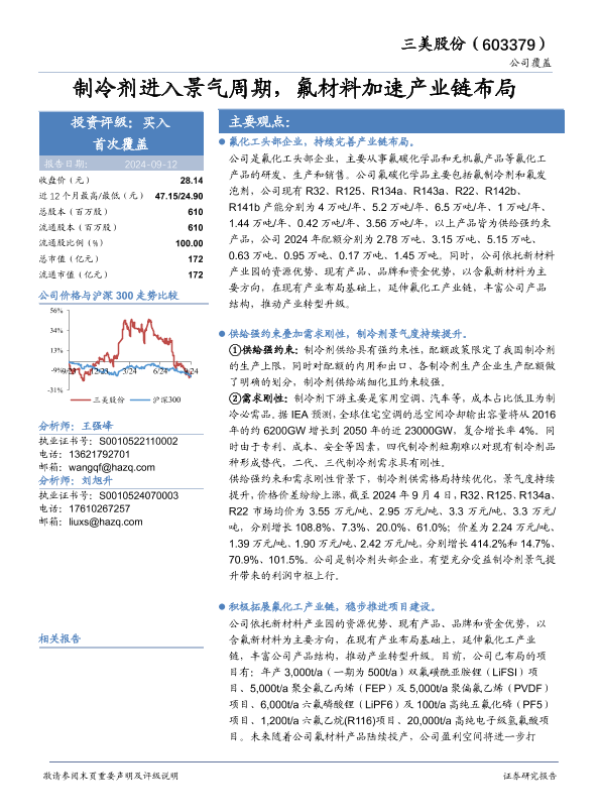 【华安证券】【20240912】三美股份(603379)制冷剂进入景气周期,氟材料加速产业链布局-35页