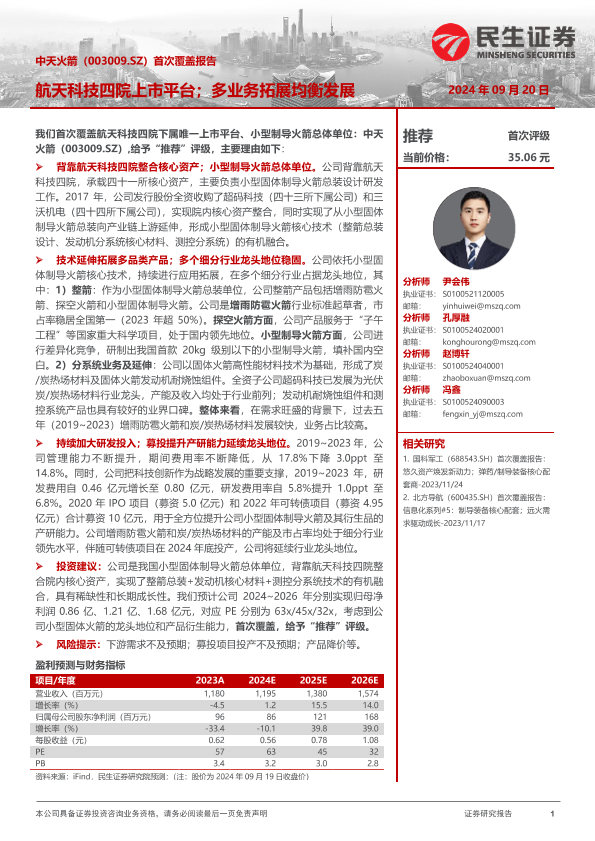 【民生证券】【202409】中天火箭(003009)首次覆盖报告:航天科技四院上市平台;多业务拓展均衡发展-32页