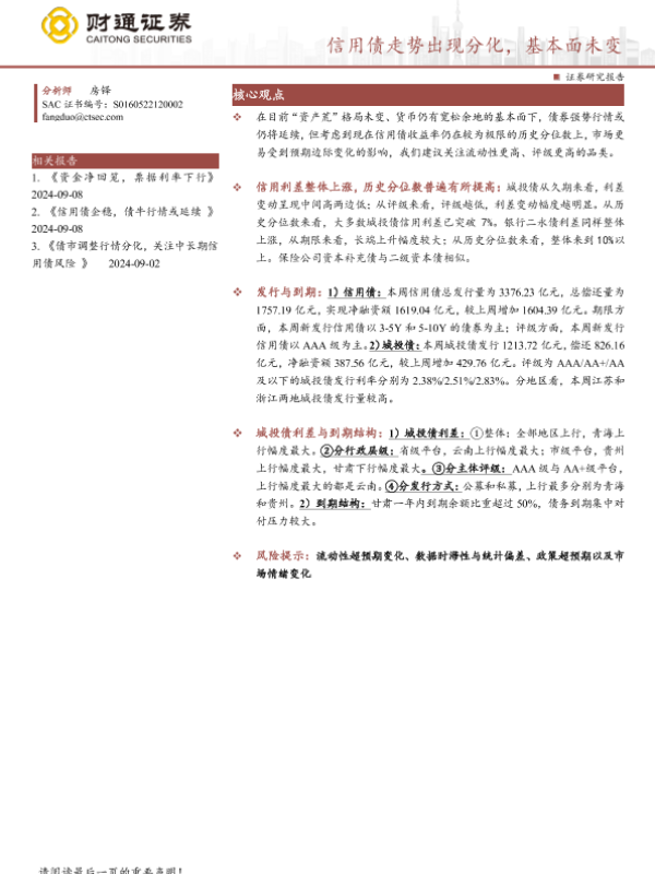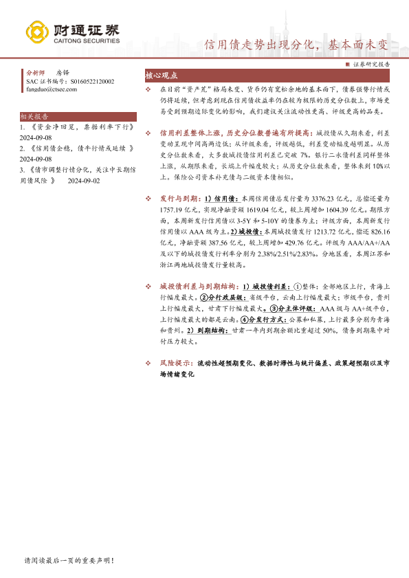 【财通证券】【20240915】信用债走势出现分化,基本面未变-13页