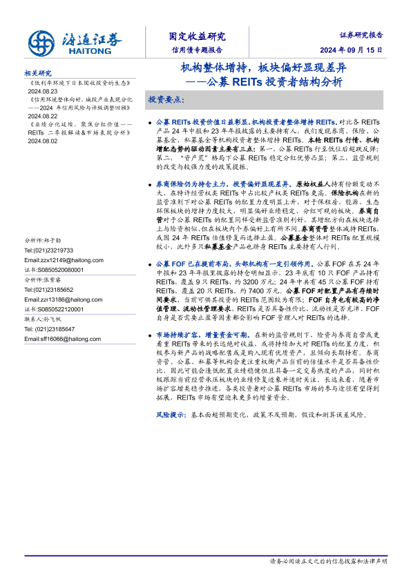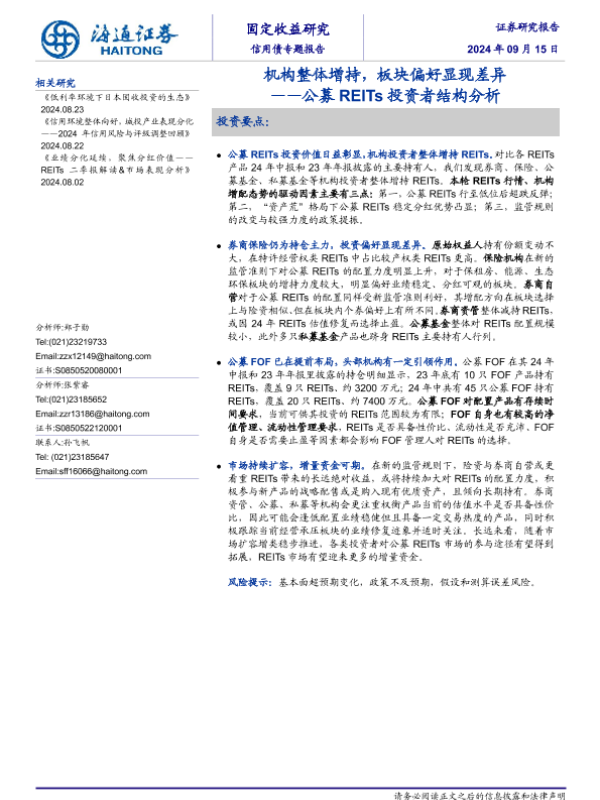 【海通证券】【202409】公募REITs投资者结构分析:机构整体增持,板块偏好显现差异-15页