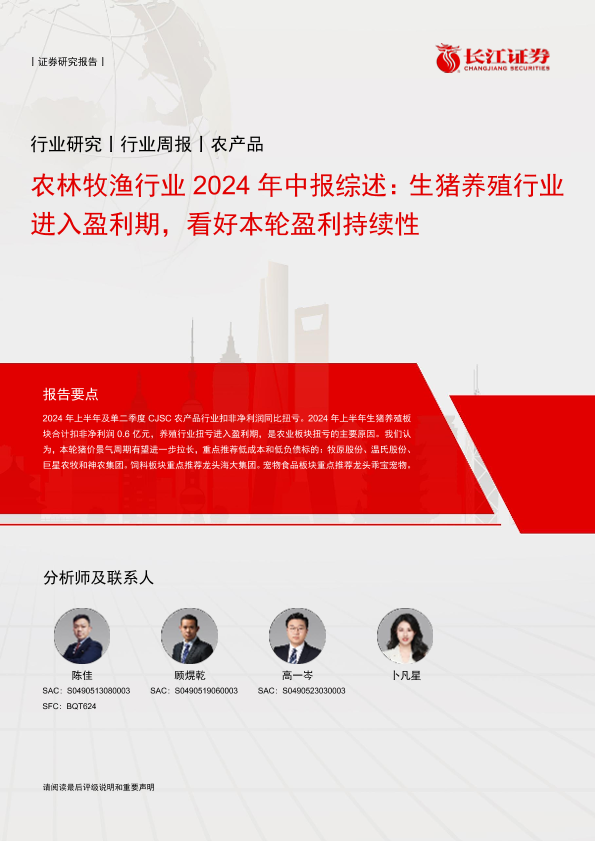 【长江证券】【20240917】农林牧渔行业2024年中报综述:生猪养殖行业进入盈利期,看好本轮盈利持续性-43页