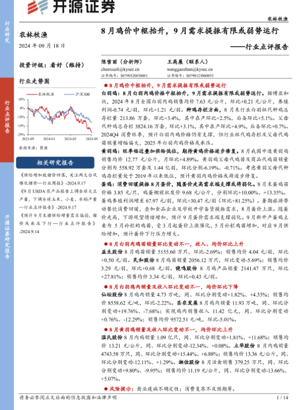 【开源证券】【20240918】农林牧渔行业点评报告:8月鸡价中枢抬升,9月需求提振有限或弱势运行-14页
