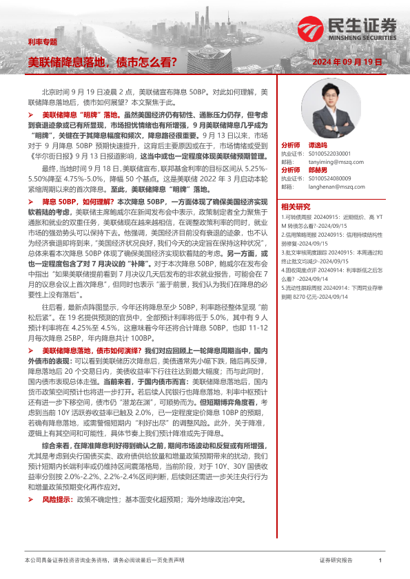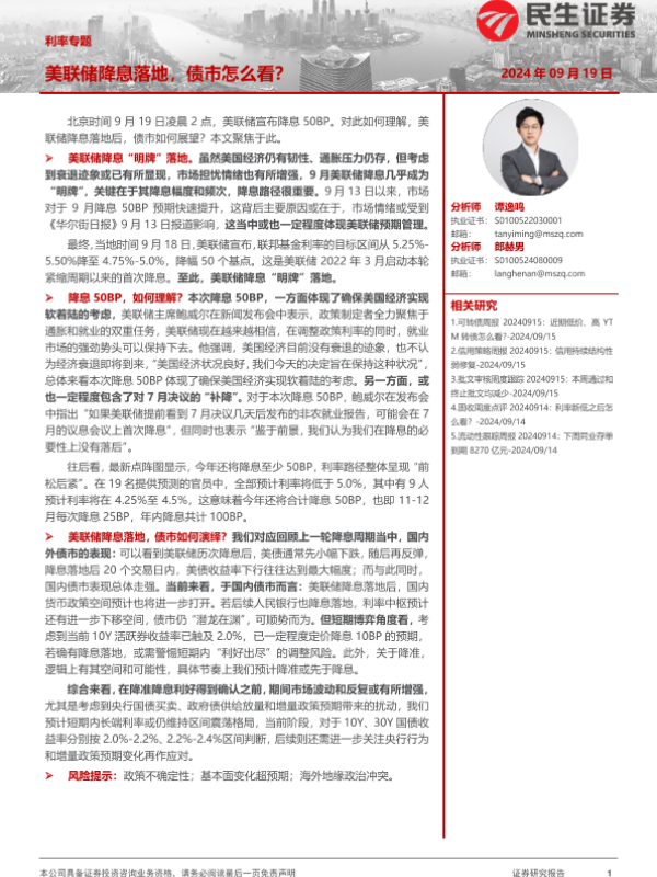 【民生证券】【20240919】利率专题:美联储降息落地,债市怎么看?-16页