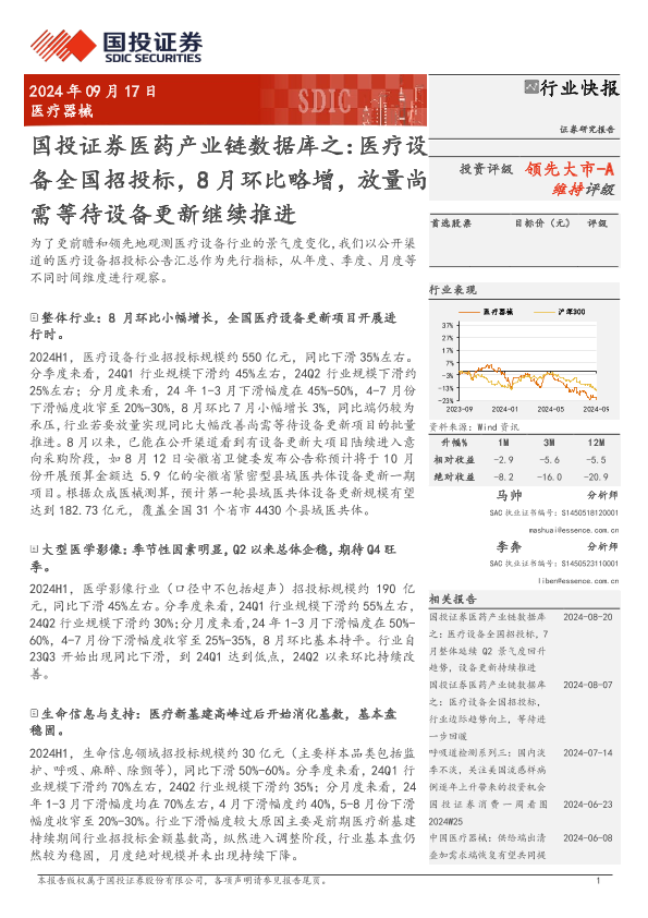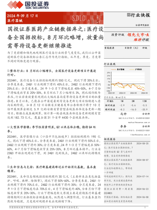【国投证券】【20240917】医疗器械行业医药产业链数据库之:医疗设备全国招投标,8月环比略增,放量尚需等待设备更新继续推进-13页