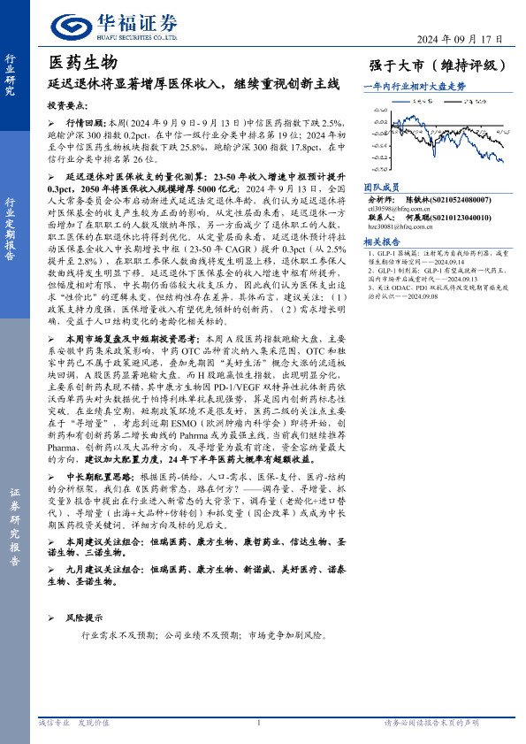 【华福证券】【20240917】医药生物行业定期报告:延迟退休将显著增厚医保收入,继续重视创新主线-14页