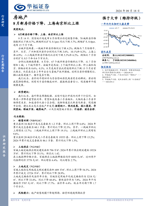 【华福证券】【20240918】华房地产行业定期报告:8月新房价格下降,上海南京环比上涨-14页